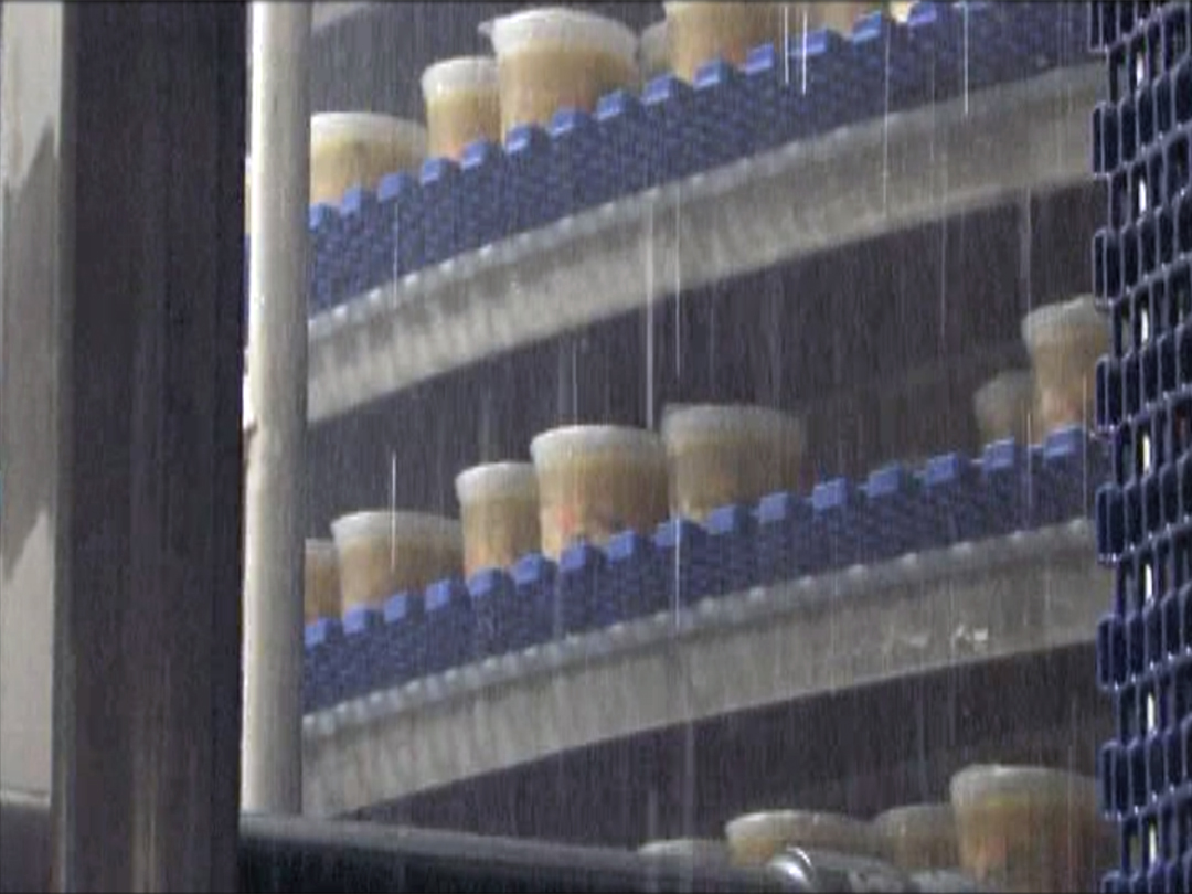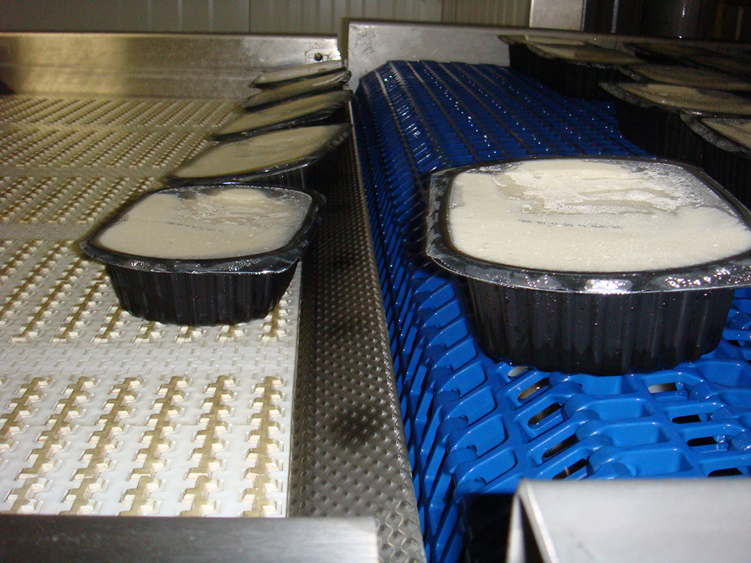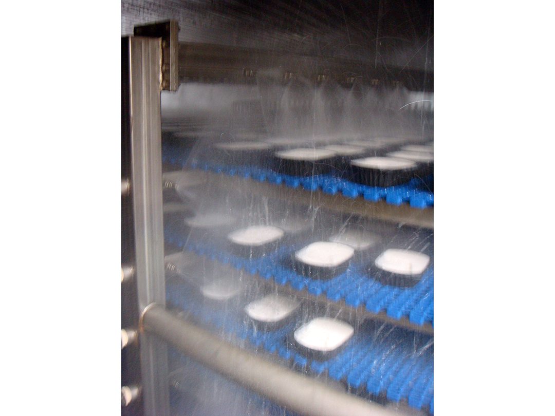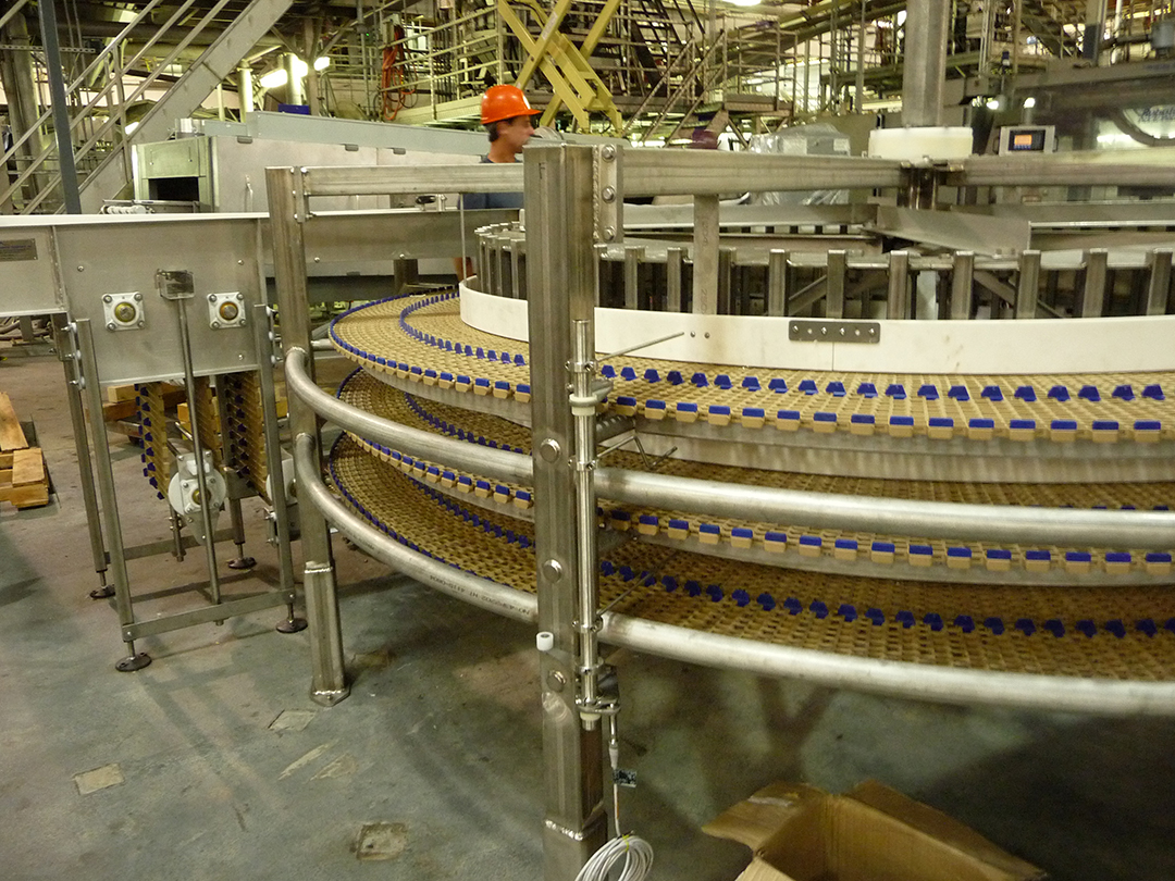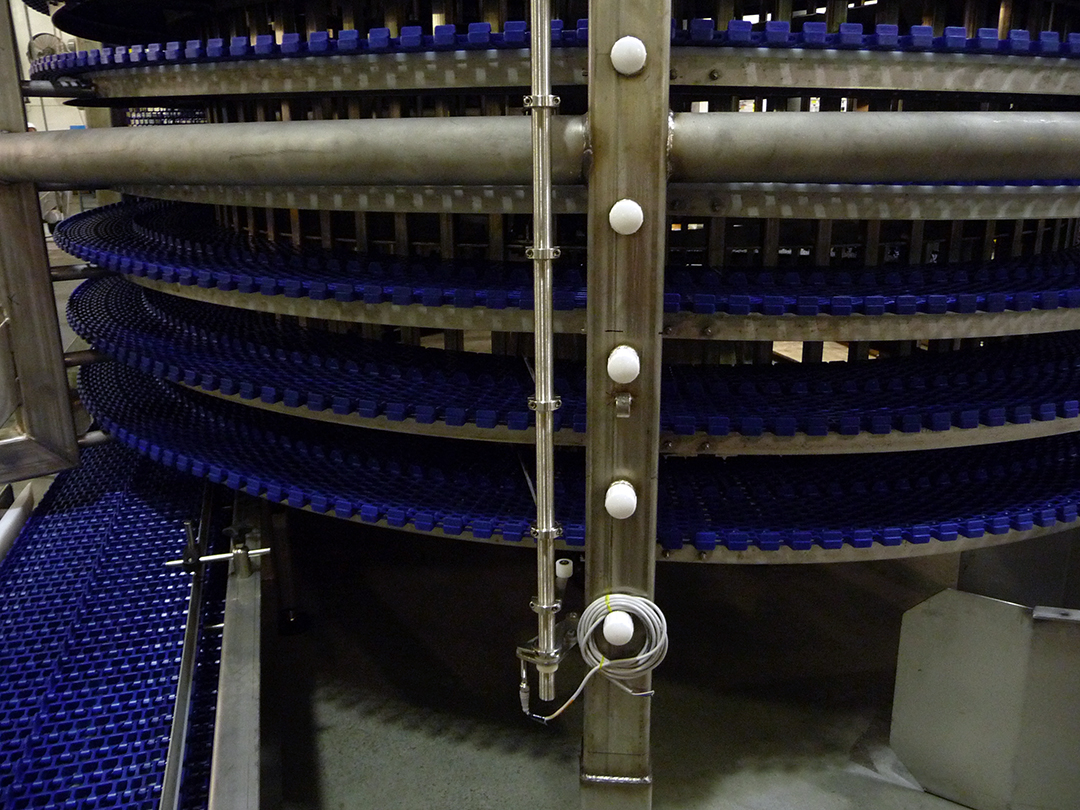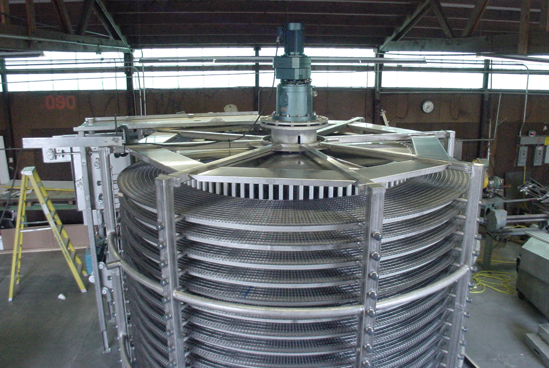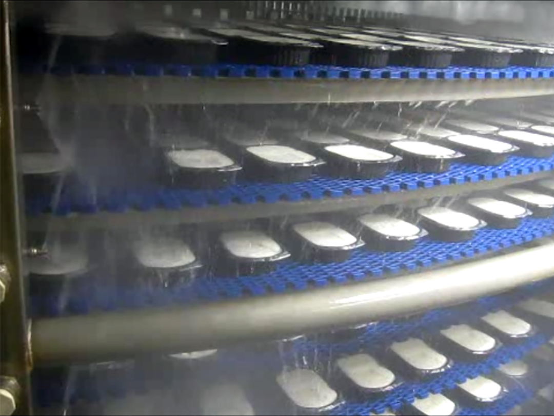 SPIRAL COOKER – Used to Sterlize Packaging Film – Features Integral Belt Product Guide Tabs to Create Product Lanes