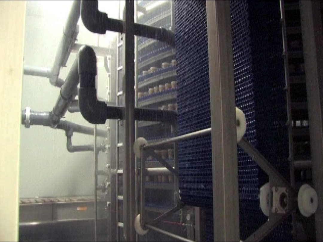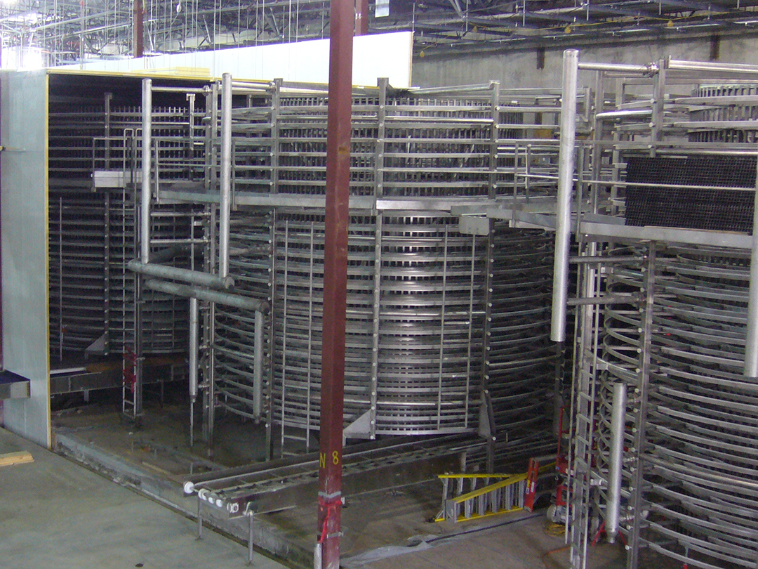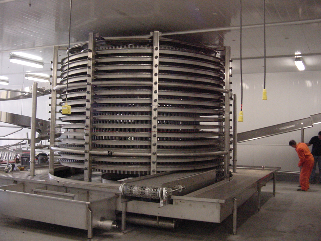 SPIRAL HYDRO CHILLER – 10000 Lb-Hr Capacity – 45 Inch Belt Width X 16 Tier Chilled from 180 dF to 40 dF using 34 dF Water @ 2400 GPM
