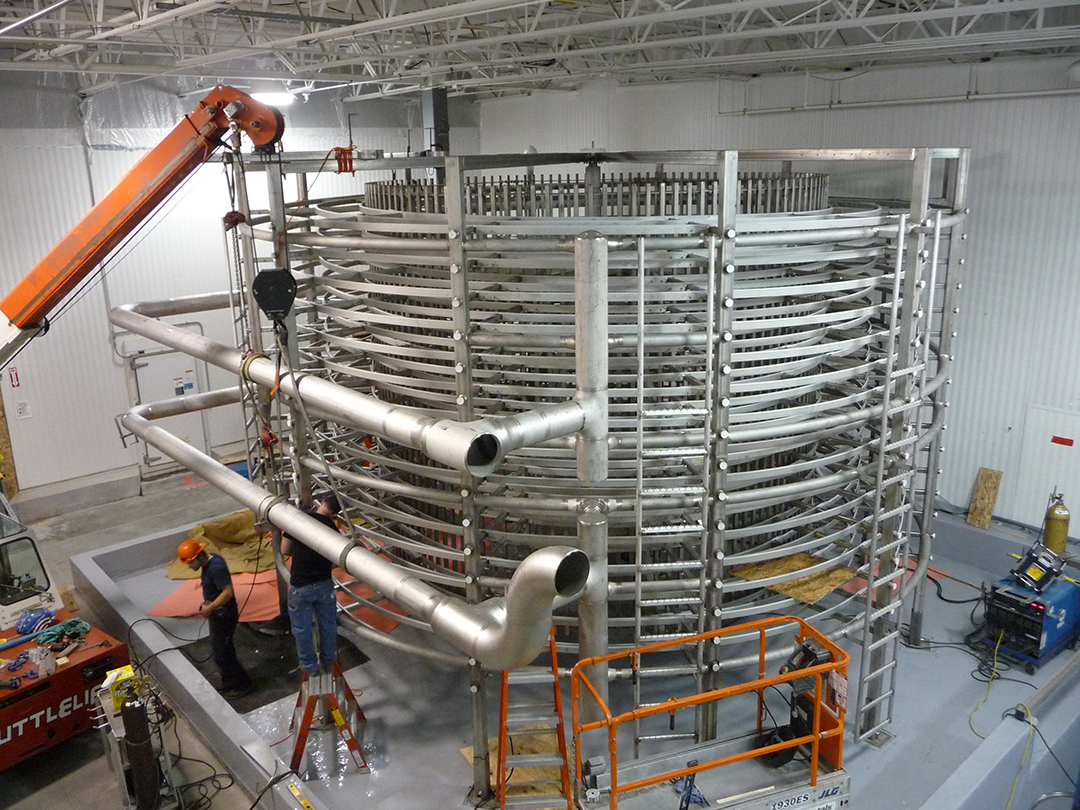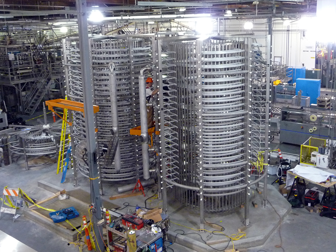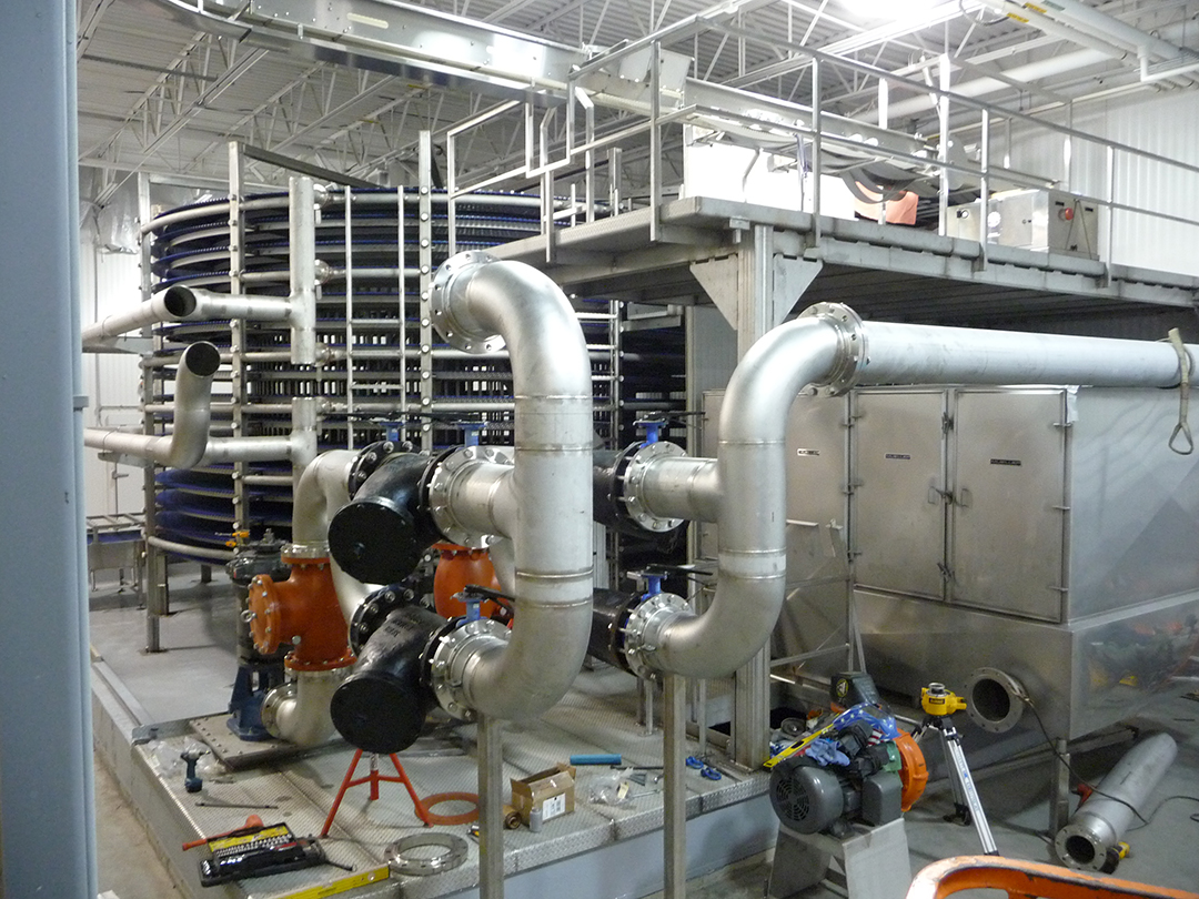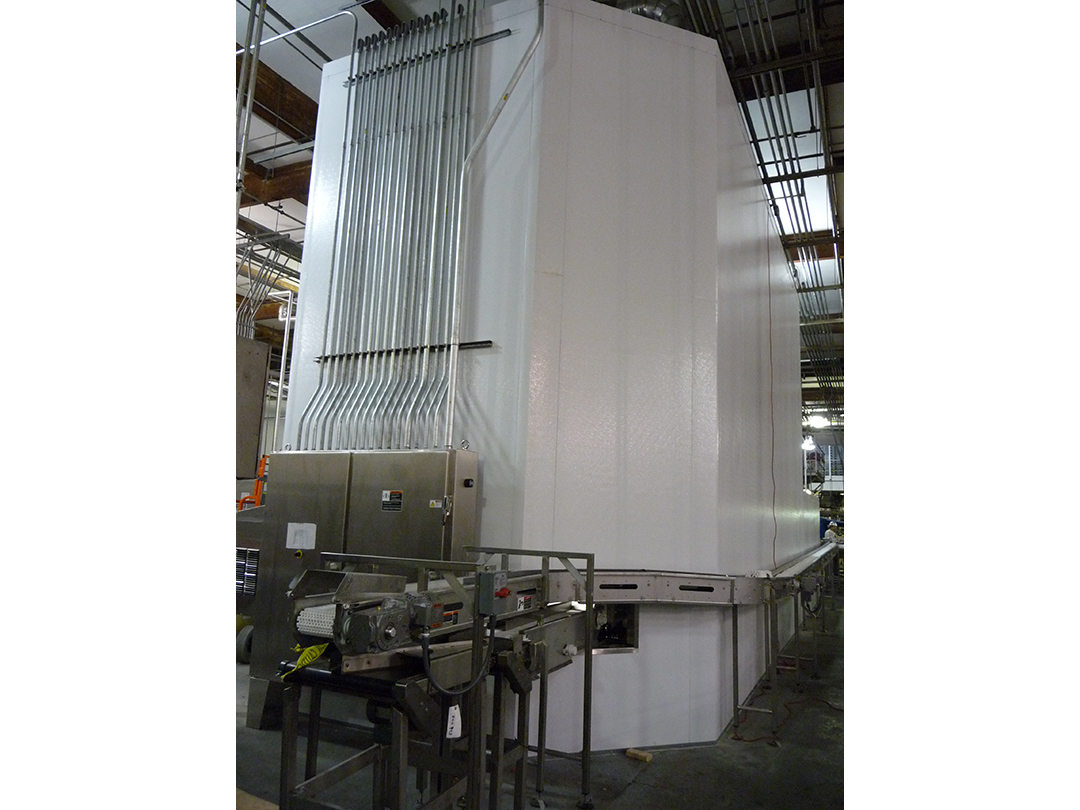 Spiral Hydro Chiller – 10000 LB per Hr Capacity – 45 Inch Belt Width X 16 Tier Chilled from 180 F to 40 F using 34 F Water @ 2400 GPM